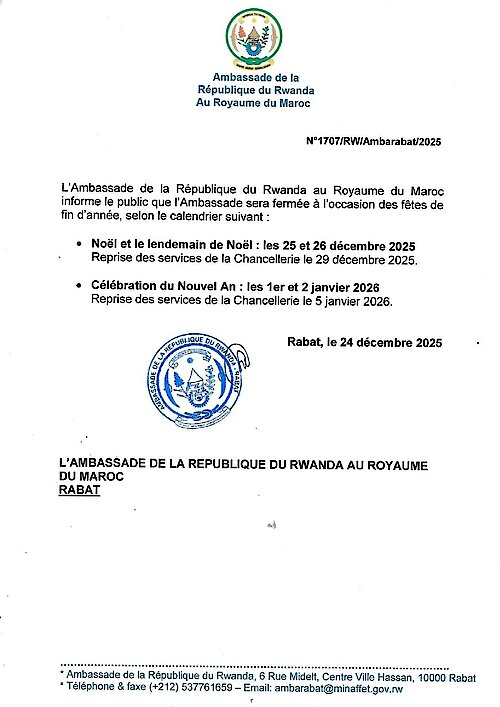 Les citoyens Marocains obtiennent un visa à l’arrivée au Rwanda, sans demande préalable et sont exemptés de frais de visa pour 30jours.