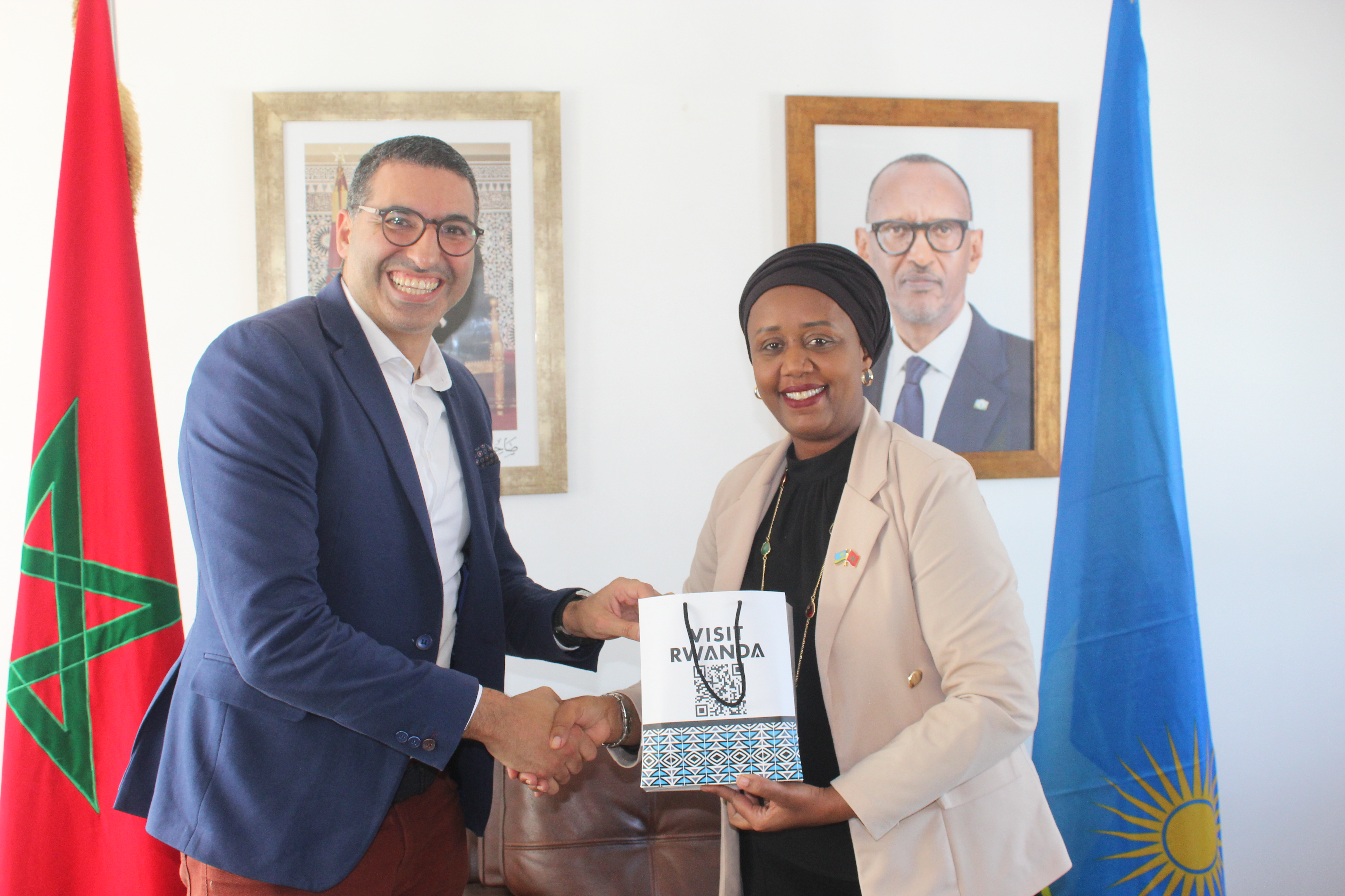 Aujourd'hui, l'ambassadeur Shakilla K. UMUTONI a rencontré M. Réda LARAICHI de Rainbow Sports Group et l'ex-footballeur Patrick MBOMA, qui a joué pour le PSG - Paris Saint-Germain, un partenaire premium de Visit Rwanda. Les discussions ont porté sur l'exploration des opportunités d'investissement au Rwanda, y compris le développement du sport.