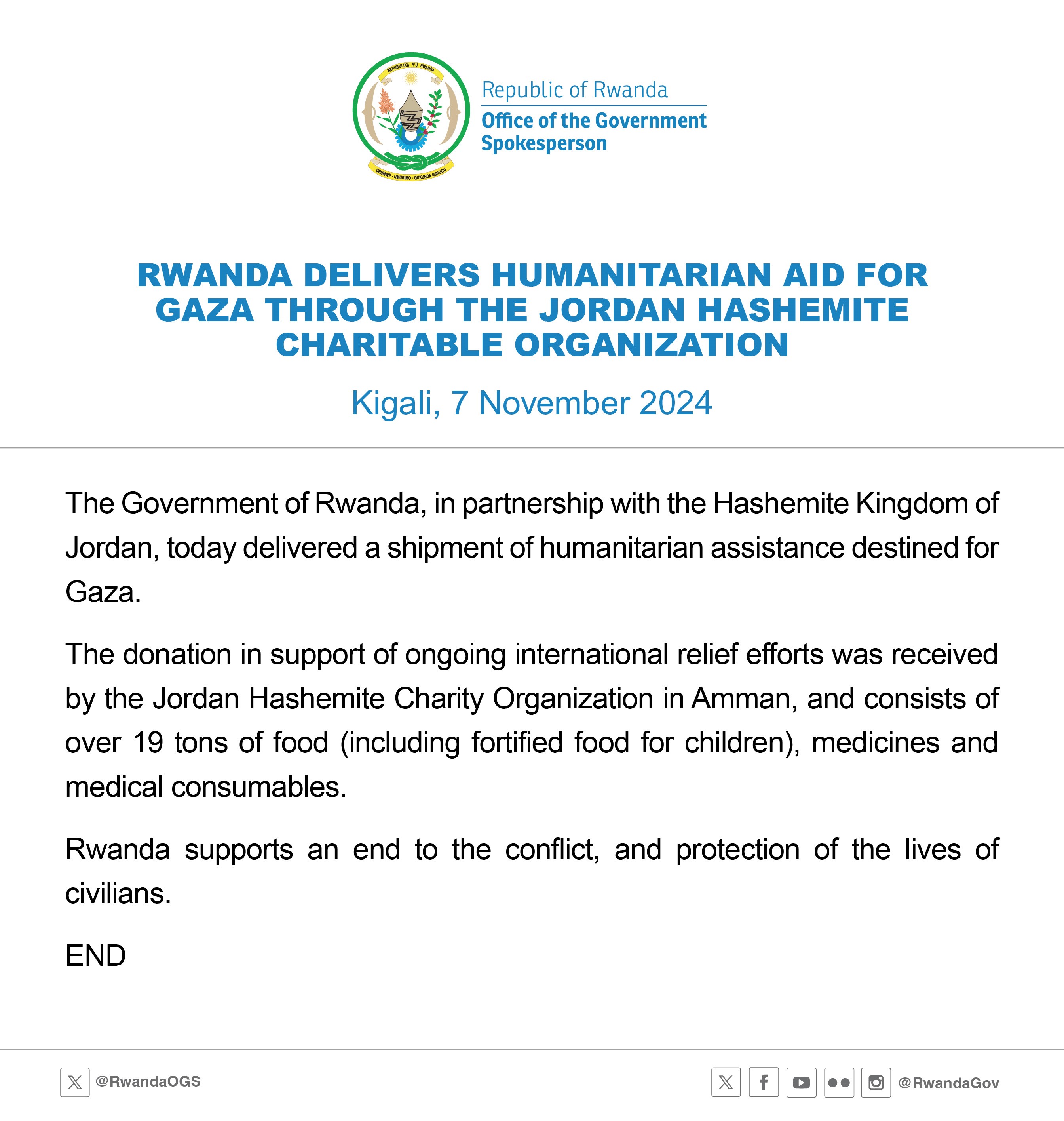 Le Gouvernement du Rwanda, en partenariat avec le Royaume Hachémite de Jordanie, a livré une cargaison d'aide humanitaire à Gaza le jeudi 7 novembre…
